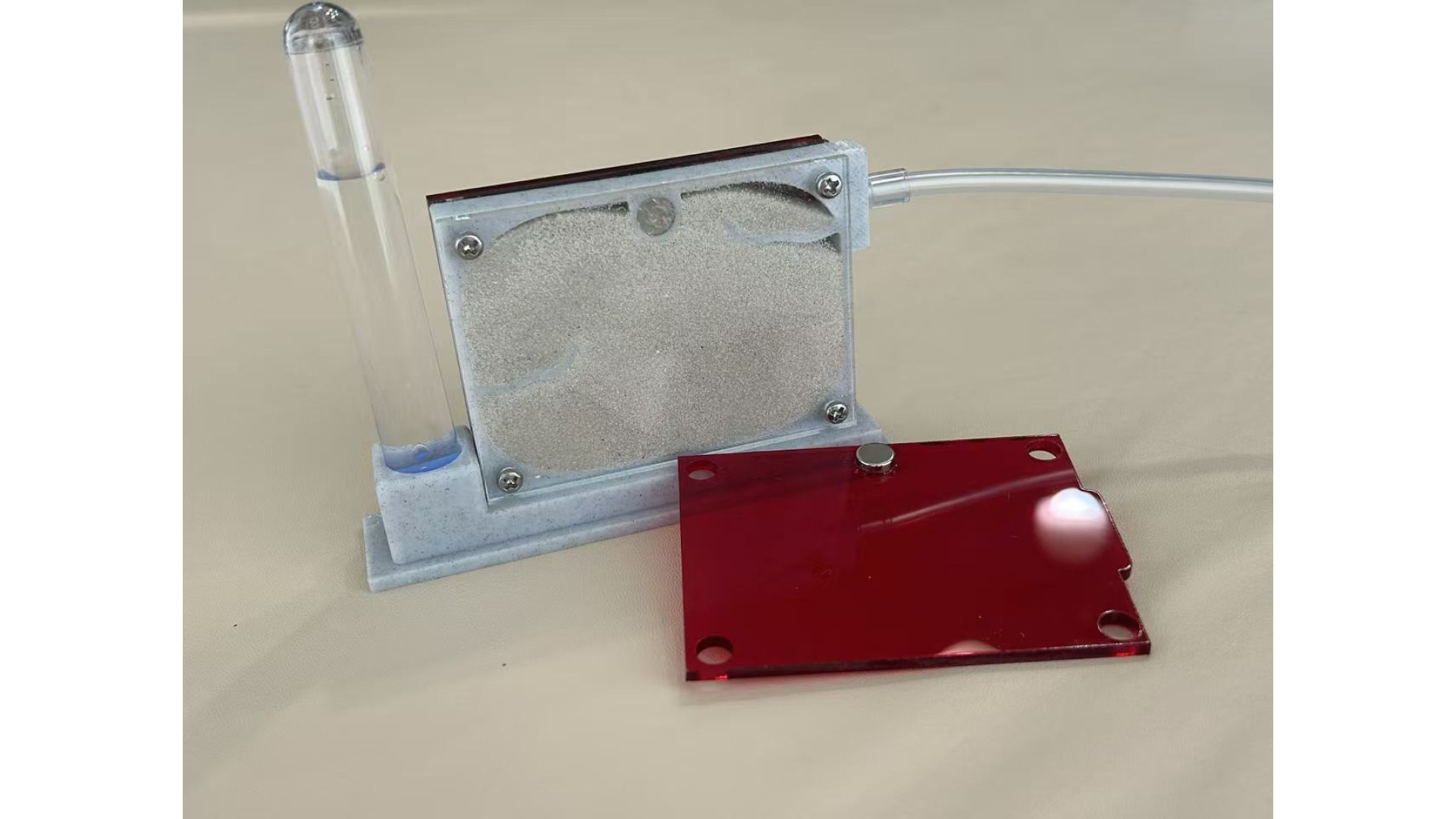 1. Prepare the Sand: Do not remove the cotton plug or connect anything yet, or sand will spill. First, fill the water tube and wait 8-12 hours. This allows the sand to absorb moisture, becoming solid and ready for digging.
