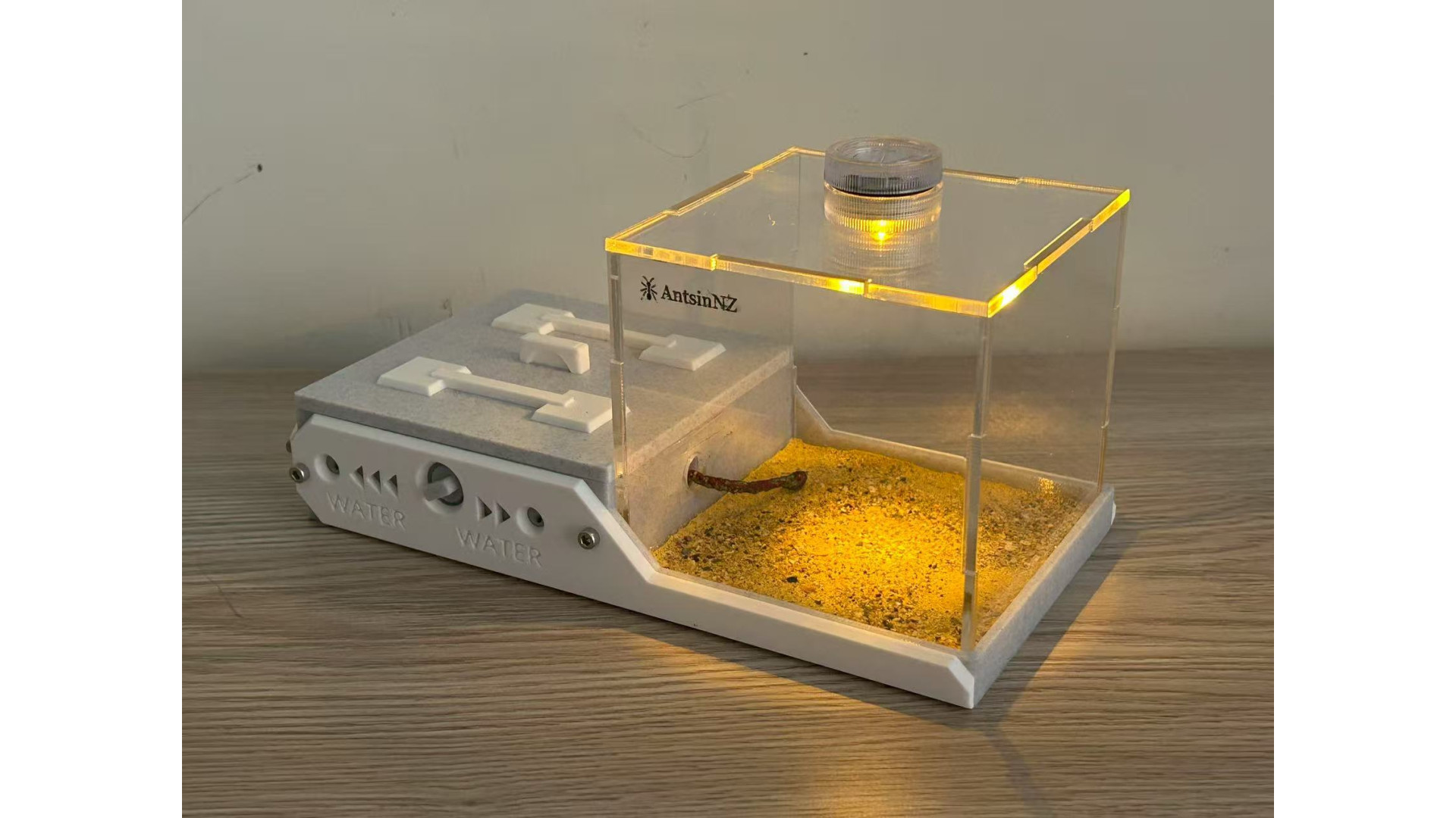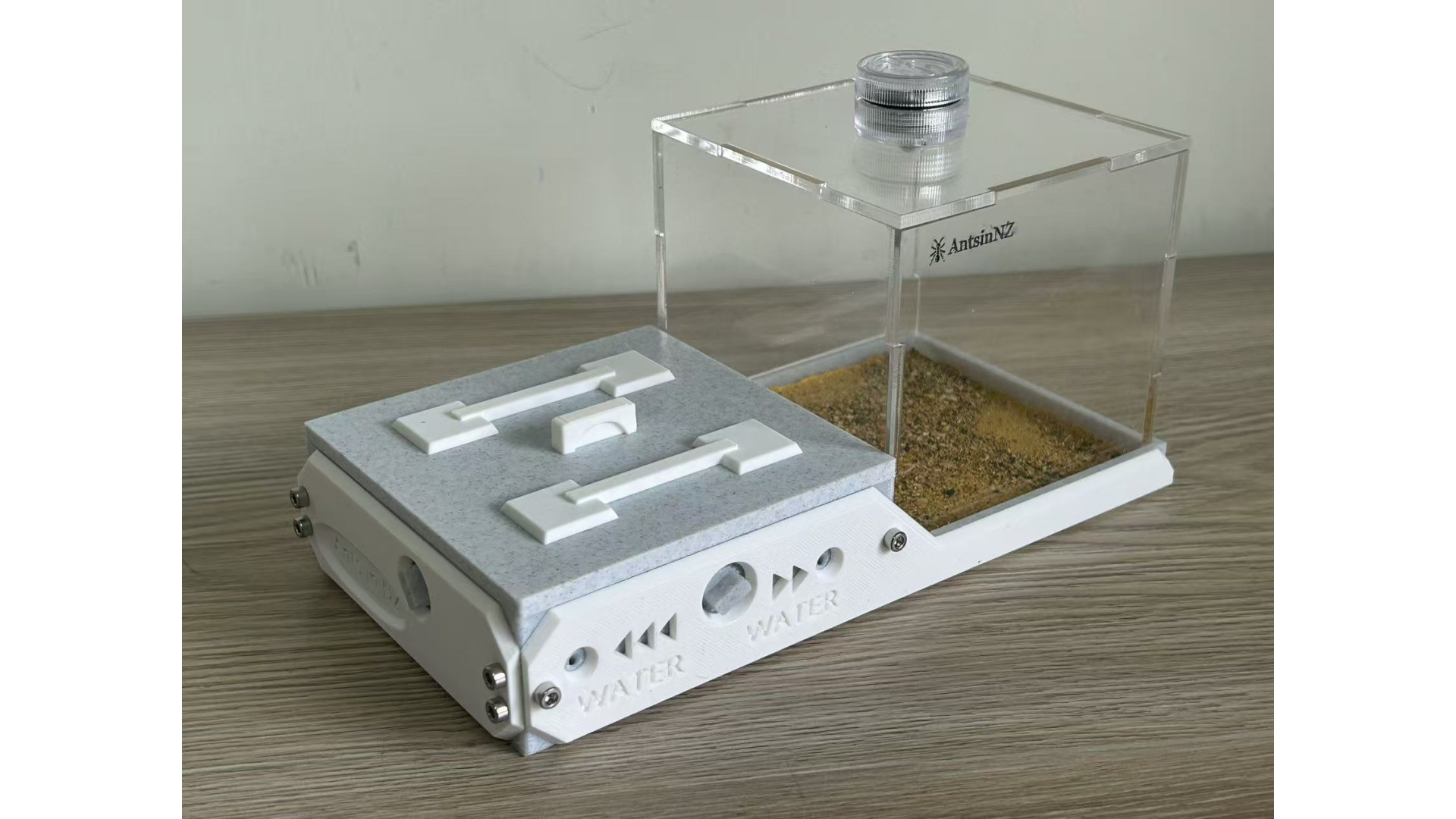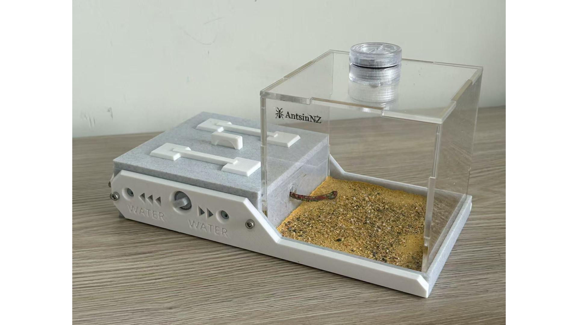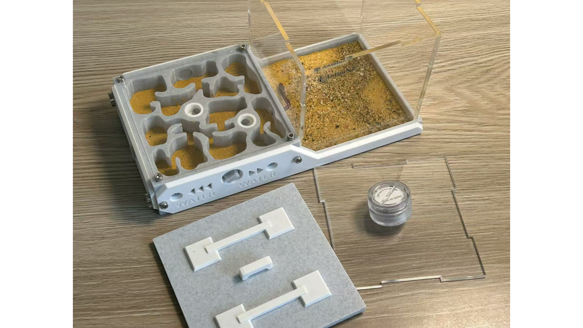 The list includes: one W3 Marble-Like farm: (210x106x106mm), This is 3D print Marble-Like PLA, not real marble. include light, decorate (5 mushroom, 1 tree root), syringe. This ant nest is designed to grow with your colony. Simply turn the central white knob to open the passage, to provide more space as the ants colony getting bigger. suggest, area 1 for colony up to 50, open area 2 can hold up to 400, open area 3 can hold up to 1000. ant need farm to fit colony size, that will let queen fell safe and lay eggs. on each side of farm have hole can screw a tube connect part in. then you can use it to connect more area you like. It has 3 water-filling holes, 1 for each area. corresponding to a different zone.(show in photo) most time you only need add water to the drinking area. some ant need more humidity, then need add water to other area. make sure ant need some dry area as well. come with a no sharp syringes as well. ants in photo is not included