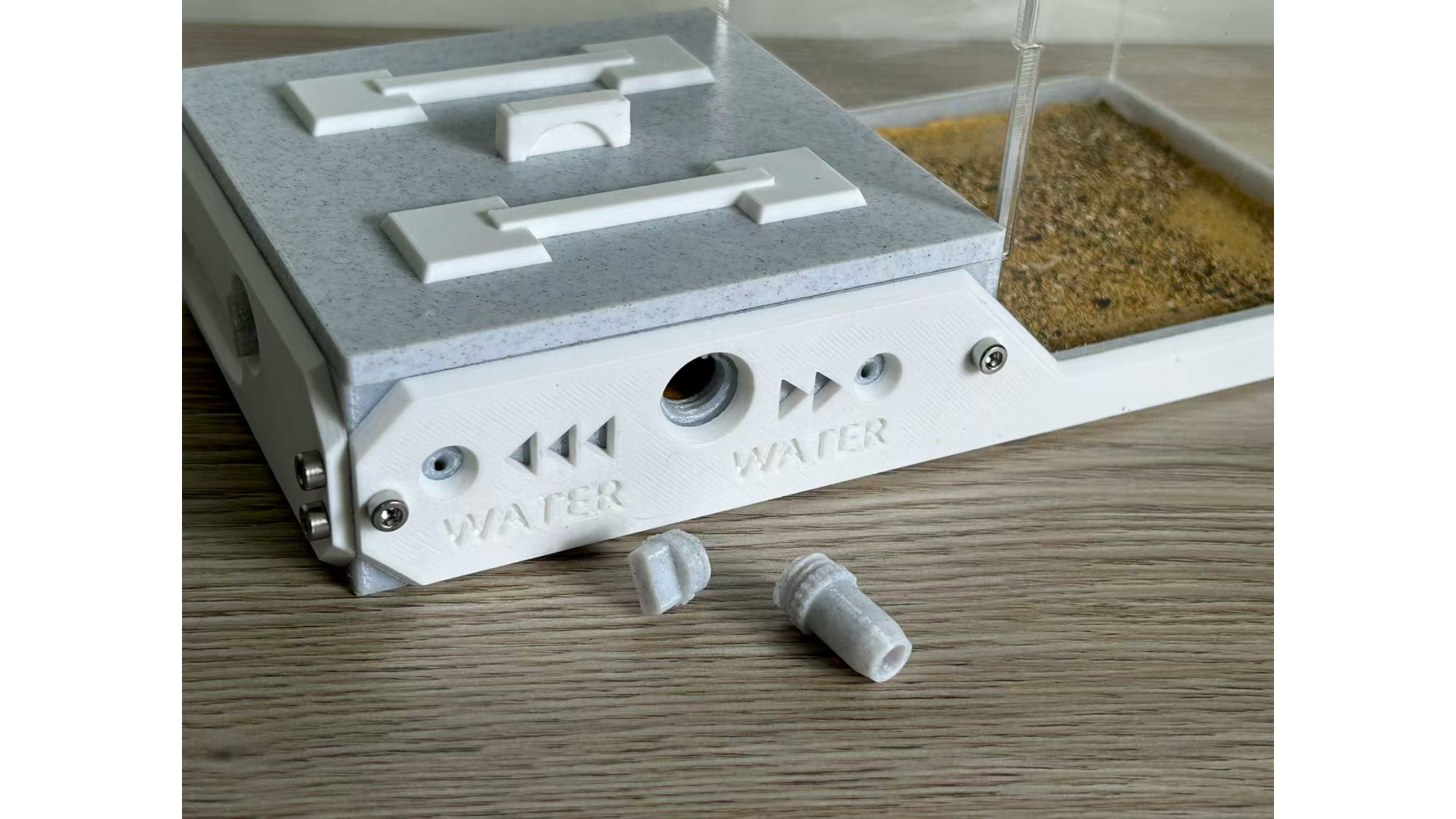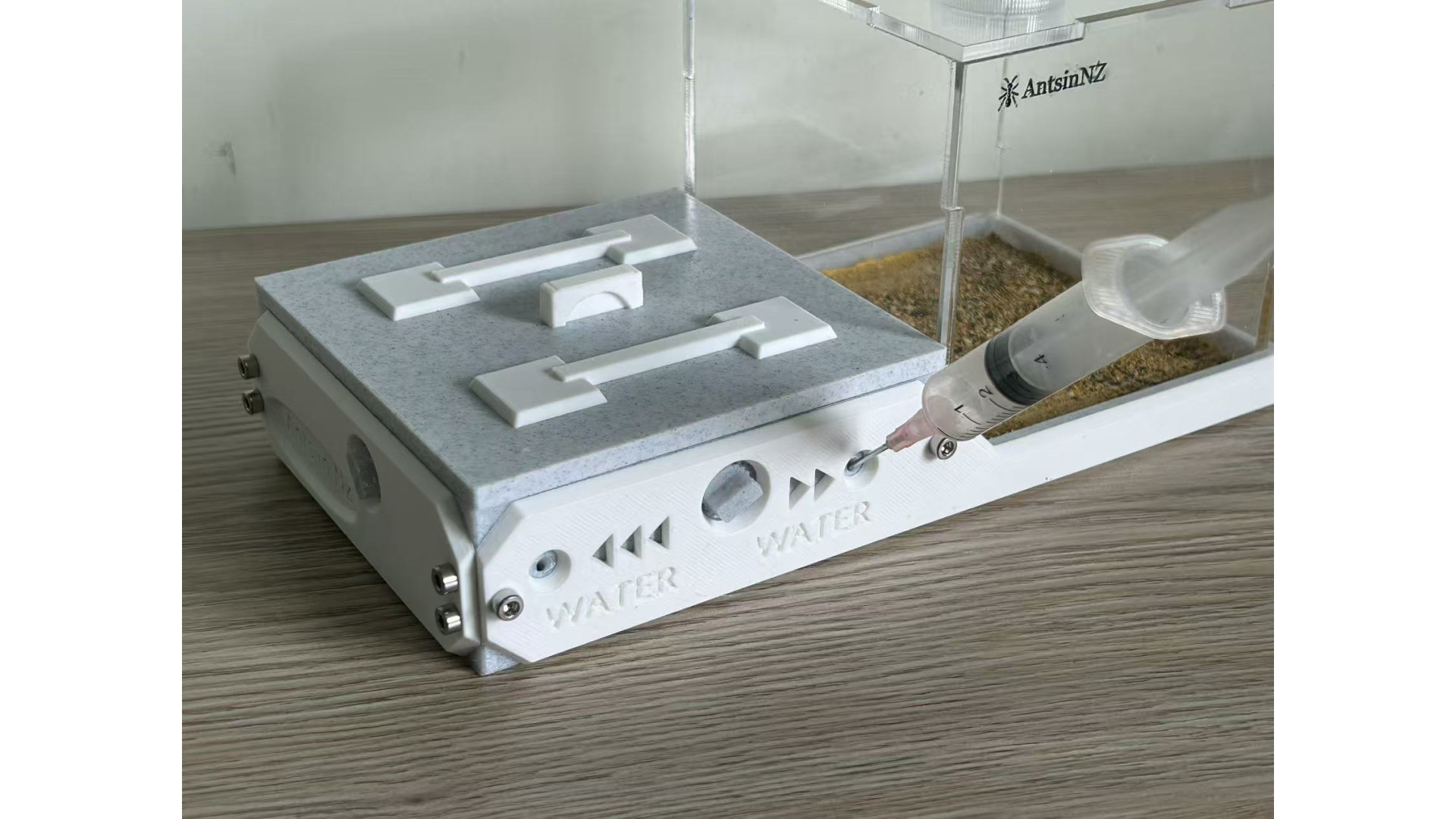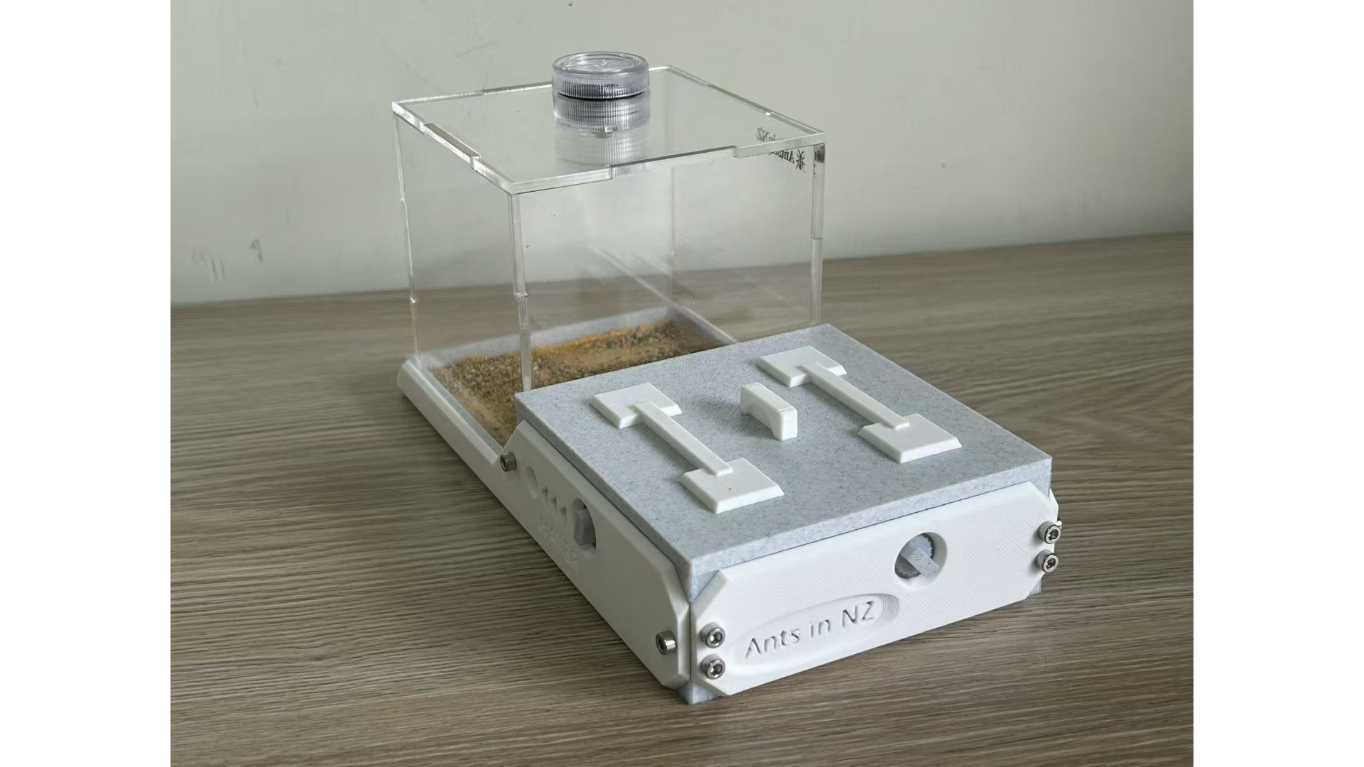 The list includes: one W3 Marble-Like farm: (210x106x106mm), This is 3D print Marble-Like PLA, not real marble. include light, decorate (5 mushroom, 1 tree root), syringe. This ant nest is designed to grow with your colony. Simply turn the central white knob to open the passage, to provide more space as the ants colony getting bigger. suggest, area 1 for colony up to 50, open area 2 can hold up to 400, open area 3 can hold up to 1000. ant need farm to fit colony size, that will let queen fell safe and lay eggs. on each side of farm have hole can screw a tube connect part in. then you can use it to connect more area you like. It has 3 water-filling holes, 1 for each area. corresponding to a different zone.(show in photo) most time you only need add water to the drinking area. some ant need more humidity, then need add water to other area. make sure ant need some dry area as well. come with a no sharp syringes as well. ants in photo is not included